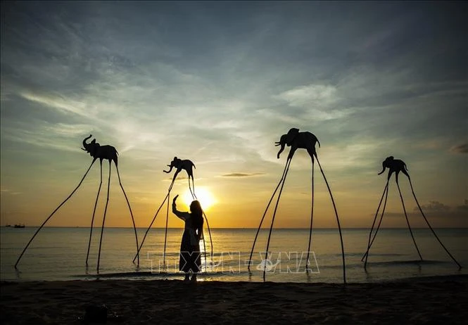 Du khách trải nghiệm không gian hoàng hôn trên Bãi Trường (Kiên Giang) - nơi được cho là địa điểm ngắm hoàng hôn đẹp nhất Việt Nam. Ảnh: Hồng Đạt - TTXVN