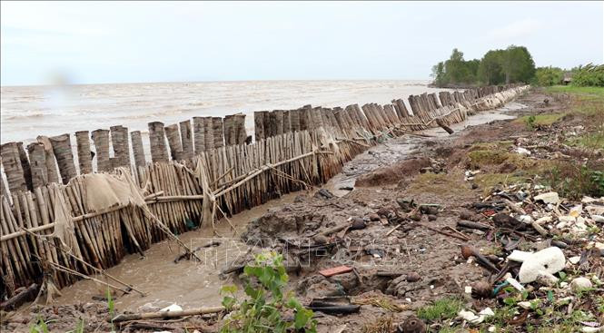 Kè tạm ngăn sạt lở bảo vệ đê quốc phòng khu vực bờ biển Tiểu Dừa, xã Vân Khánh Tây, huyện An Minh, tỉnh Kiên Giang. Ảnh: Lê Huy Hải - TTXVN