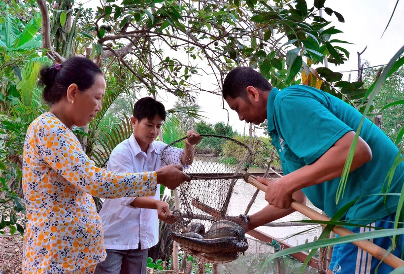 Gia đình ông Danh Tiết, dân tộc Khmer ở ấp Thu Đông, xã Thới Quản, huyện Gò Quao đã vay vốn ưu đãi từ Ngân hàng Chính sách - Xã hội, mua cá lóc giống thả nuôi, mang lại thu nhập và việc làm ổn định cho gia đình. Ảnh: Lê Sen