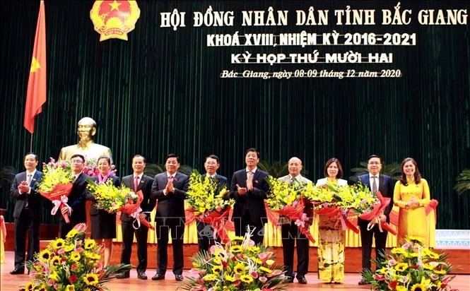 Thường trực HĐND tỉnh Bắc Giang tặng hoa chúc mừng các đồng chí vừa được bầu giữ chức Chủ tịch, Phó Chủ tịch và Ủy viên UBND tỉnh Bắc Giang. Ảnh: Đồng Thúy-TTXVN