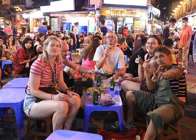 Du khách nước ngoài ăn uống tại phố Tạ Hiện, Hà Nội. Ảnh: Hoàng Hiếu - TTXVN