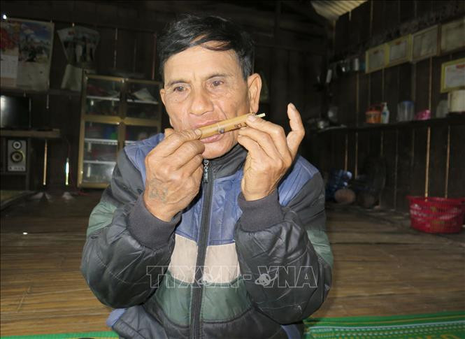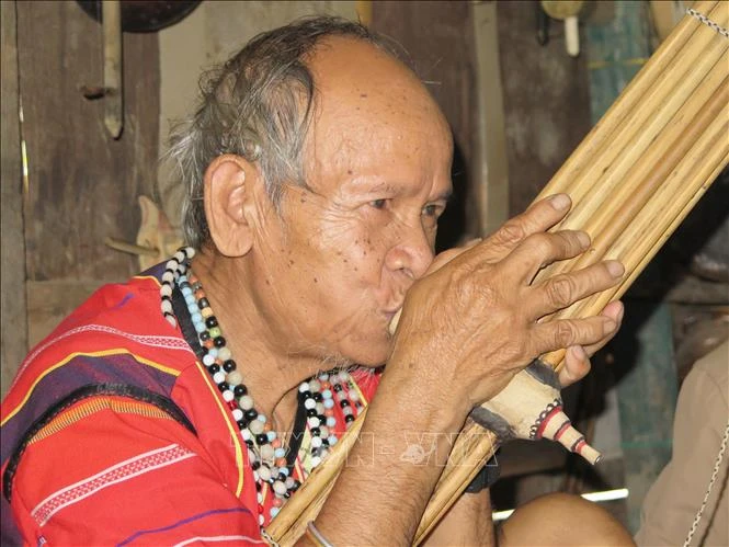 Nghệ nhân ưu tú A Brol Vẽ (làng Đăk Răng, xã Đăk Dục, huyện Ngọc Hồi) thổi khèn – một trong 14 nhạc cụ truyền thống của người Giẻ Triêng. Ảnh: Dư Toán – TTXVN