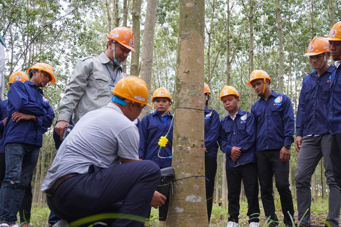 Đào tạo nghề cạo mủ cao su giúp con em đồng bào dân tộc có thể áp dụng ngay vào thực tế vườn cây cao su của gia đình, các nông trường. Ảnh: Văn Phương