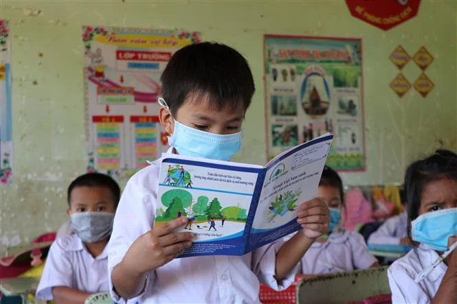 Học sinh trường Tiểu học Nguyễn Văn Cừ ở xã Đăk Pxi huyện Đăk Hà (Kon Tum) được Quỹ Bảo vệ và Phát triển rừng tỉnh Kon Tum hỗ trợ giúp các em tự tin đến lớp. Ảnh: Cao Nguyên-TTXVN