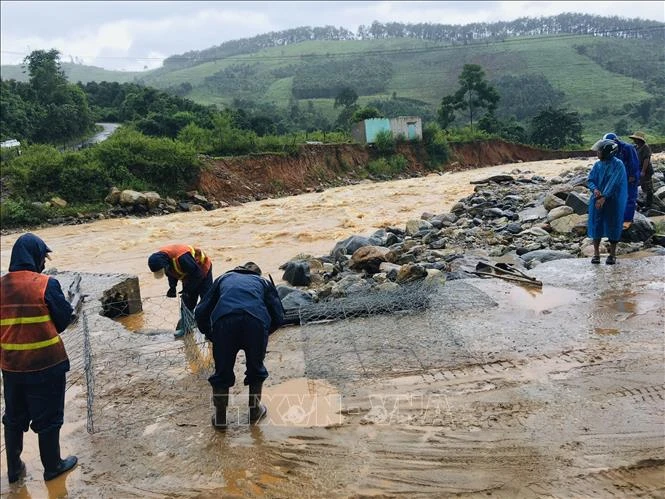 Lực lượng chức năng huyện Tu Mơ Rông, tỉnh Kon Tum khắc phục vị trí hư hỏng tại cầu tràn Năng Nhỏ 1, tỉnh lộ 678. Ảnh: TTXVN phát