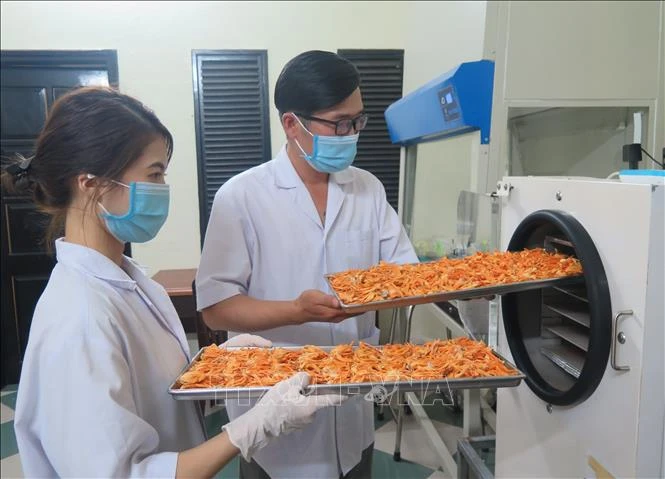 Đưa Đông trùng hạ thảo tươi đi sấy thăng hoa. Ảnh: Dư Toán – TTXVN