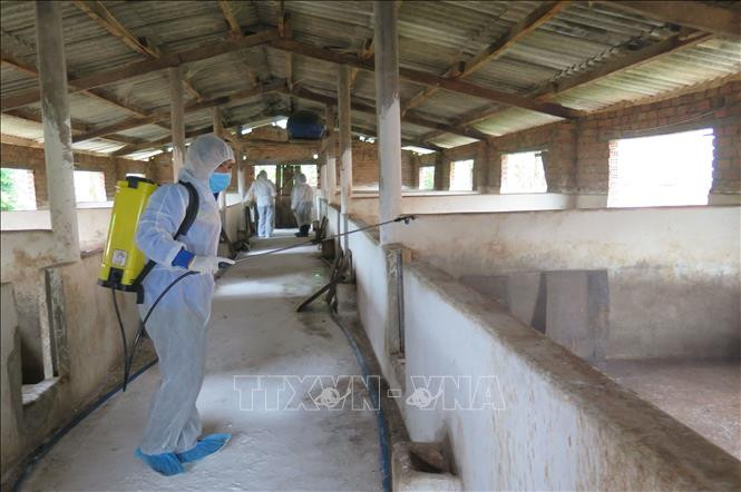 Lực lượng thú y phun hóa chất xử lý bệnh lở mồm long móng. Ảnh: Dư Toán – TTXVN