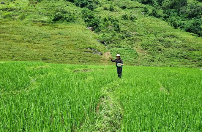 Cán bộ nông nghiệp kiểm tra sinh trưởng của cây lúa tại cánh đồng lúa trồng thí điểm 2 vụ ở xã Ngọc Linh, huyện Đăk Glei, tỉnh Kon Tum. Ảnh: Dư Toán – TTXVN