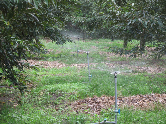 Diện tích cây sầu riêng của Hợp tác xã Nông nghiệp, Thương mại và Dịch vụ Ia Chim (Kon Tum) được ứng dụng công nghệ tưới tiết kiệm giúp giảm chi phí. Ảnh: Dư Toán -TTXVN