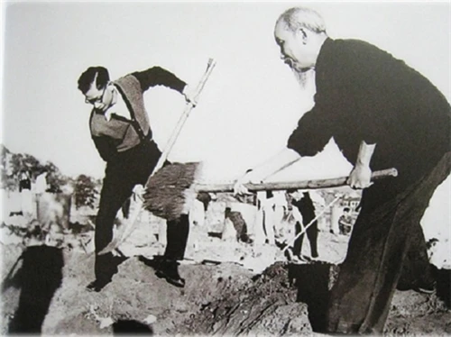 | Chủ tịch Hồ Chí Minh cùng bác sĩ Trần Duy Hưng tham gia lao động tại Công viên Thống Nhất. Nguồn ảnh: internet |