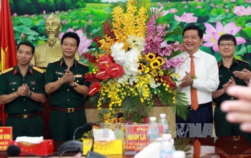 | Đồng chí Đinh La Thăng, Ủy viên Bộ Chính trị, Bí thư Thành ủy Thành phố Hồ Chí Minh thăm và tặng hoa chúc mừng tập thể lãnh đạo, y, bác sỹ Bệnh viện Quân y 175. Ảnh: Phương Vy-TTXVN. |