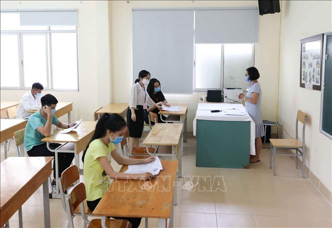 Thí sinh thi tốt nghiệp THPT 2020 đợt 2 làm thủ tục dự thi tại điểm thi Trường THPT Việt - Đức (quận Hoàn Kiếm, Hà Nội). Ảnh: Thanh Tùng - TTXVN