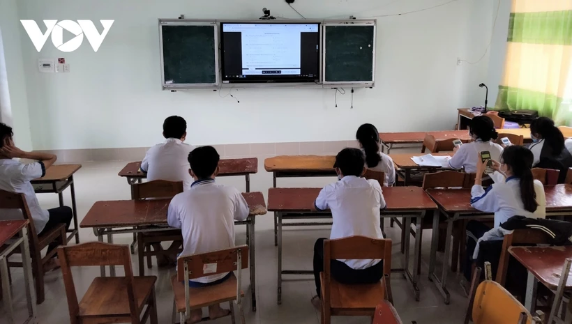Các em học sinh yếu tại trường THPT Thới Lai, huyện Thới Lai ôn trực tuyến tại trường. Ảnh: vov.vn