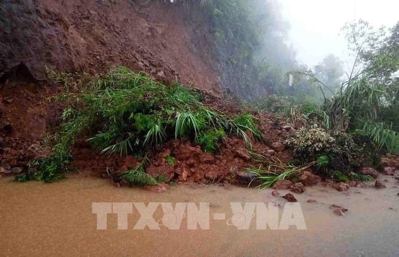 Tại Km 35+150 (địa phận bản Séo Lèng 2, Xã Phìn Hồ, huyện Sìn Hồ, Lai Châu) xảy ra sạt lở taluy dương, khó khăn cho người tham gia giao thông. ẢNh: TTXVN phát