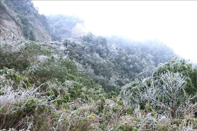 Băng giá phủ kín đoạn đèo Ô Quy Hồ thuộc địa phận tỉnh Lai Châu đi Sa Pa. Ảnh: Nguyễn Oanh-TTXVN