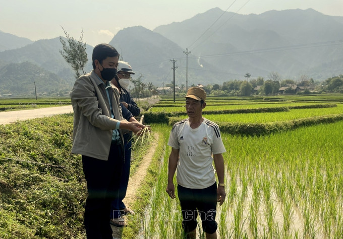 Cán bộ xã Mường Than, huyện Than Uyên (Lai Châu) phối hợp với cán bộ Phòng Nông nghiệp và Phát triển Nông thôn huyện hướng dẫn bà con cách nhận biết sâu bệnh trên lúa tại cánh đồng bản Én Luông. Ảnh: baolaichau.vn