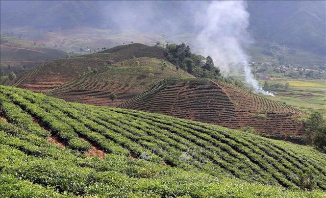 Vùng nguyên liệu chè của xã Phúc Khoa, huyện Tân Uyên một trong những mô hình sản xuất phát triển kinh tế góp phần xóa đói giảm nghèo bền vững cho người dân trên địa bàn. Ảnh: Quý Trung – TTXVN