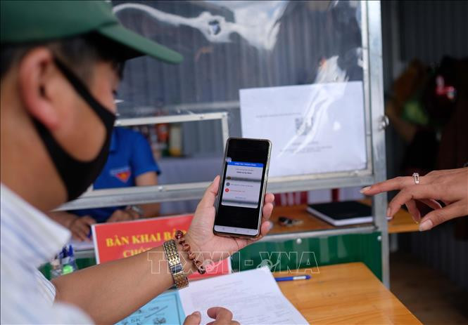Một số người dân khi đi qua chốt kiểm soát dịch ở "vùng Xanh" xã Đạ Nhim (huyện Lạc Dương) được hướng dẫn sử dụng phần mềm khai báo y tế điện tử nhanh chóng, tiện lợi hơn bản khai giấy. Ảnh: Nguyễn Dũng – TTXVN