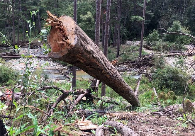 Tại hiện trường ước tính 100 cây thông cổ thụ đã bị đốn hạ, nằm ngổn ngang. Ảnh Đặng Tuấn – TTXVN