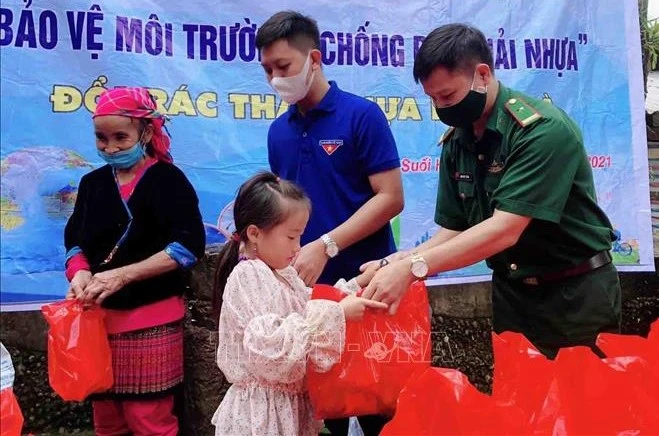 Lực lượng đoàn viên, thanh niên huyện Phong Thổ phối hợp với Đồn Biên phòng Sin Suối Hồ trao quà cho người dân, trẻ em khi đến đổi nhựa. Ảnh: Đinh Thùy-TTXVN