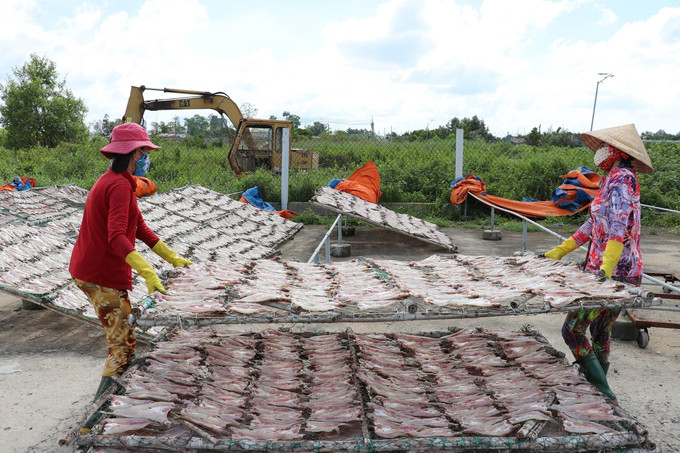 Cơ sở sản xuất, cung ứng hải sản, khô, ruốc nổi tiếng của chị Trần Thị Thu ở khu phố 2, thị trấn Vàm Láng trung bình mỗi ngày có 26 nhân công tham gia các khâu xẻ cá, phơi khô, vào dịp Tết tăng gần 40 người tham gia sản xuất. Thu nhập bình quân của mỗi lao động từ 3,5 - 4 triệu đồng/tháng, vào những lúc tàu đánh bắt được mùa thì thu nhập có thể tăng hơn vì lượng cá xẻ khô nhiều. Sản phẩm khô của chị chủ yếu được tiêu thụ ở Thành phố Hồ Chí Minh với lượng thành phẩm trung bình mỗi ngày 1 tấn khô cá mối, cá đổng, cá lưỡi trâu… Vào ngày thường, cơ sở cung cứng ra thị trường hơn 1 tấn khô các loại, riêng vào những ngày giáp Tết, số lượng sản phẩm khô tăng hơn 2 tấn/ngày.