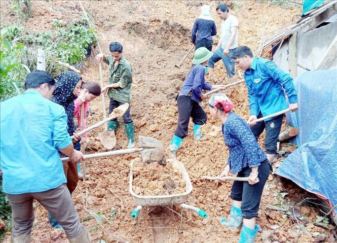 Đoàn viên, thanh niên giúp dân khắc phục sạt lở do mưa lũ gây ra tại Lạng Sơn. Ảnh: Thái Thuần – TTXVN