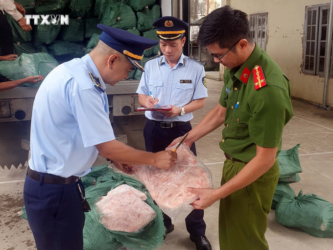Tiến hành kiểm tra chiếc xe ô tô này, lực lượng chức năng phát hiện bên trong thùng xe cất giấu chân gà rút xương đóng trong bao tải, loại 20 kg/bao, trọng lượng 1.000 kg và móng giò lợn đóng trong bao tải, loại 25 kg/bao, trọng lượng 6.000 kg. Các mặt hàng trên đều được bảo quản đông lạnh và không có căn cứ xác định nguồn gốc, nơi sản xuất, xuất xứ của hàng hóa.
