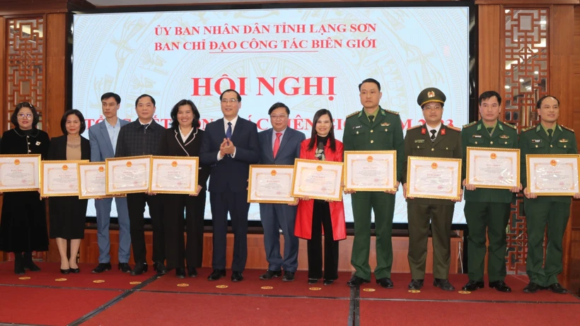 Lãnh đạo UBND tỉnh Lạng Sơn trao Bằng khen cho các tập thể, cá nhân có thành thành tích xuất sắc trong công tác biên giới năm 2023. Ảnh: Quang Duy - TTXVN