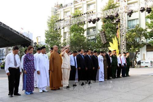 Các đại biểu dâng hoa Chủ tịch Hồ Chí Minh tại Công viên tượng đài Bác Hồ (phố đi bộ Nguyễn Huệ). Ảnh: Thanh Vũ-TTXVN