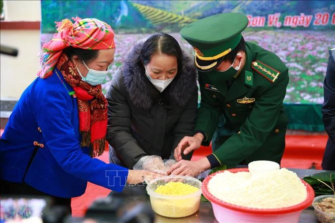 Thứ trưởng, Phó Chủ nhiệm Ủy ban Dân tộc Hoàng Thị Hạnh cùng đồng bào dân tộc và các bộ, chiến sĩ Đồn biên phòng Sơn Vĩ gói bánh chưng. Ảnh: Nguyễn Chiến - TTXVN