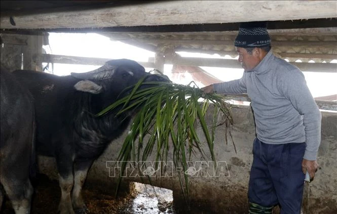 Gia đình ông Má A Vàng, tổ 3, phường Hàm Rồng, thị xã Sa Pa, tỉnh Lào Cai, chăm sóc đàn trâu trong những ngày đông giá rét. Ảnh: Quốc Khánh - TTXVN