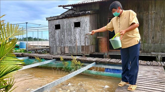 Ông Bảy Bon cho cá ăn. Ảnh: Thu Hiền - TTXVN