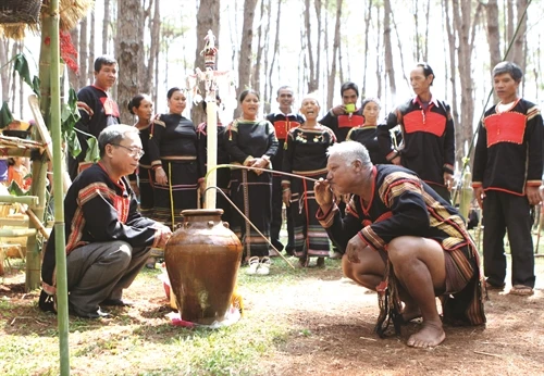 | Tái hiện hình ảnh chọc lỗ tra hạt trong lễ cầu mùa |