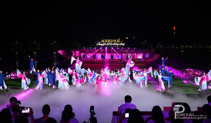 Đặc biệt, sân khấu chương trình có bối cảnh dòng sông Hương; toàn cảnh không gian được kết hợp dưới nước, trên bờ, cồn cát, cỏ hoa trên sông... Khán giả được nhìn ngắm vẻ đẹp của hàng trăm tà áo dài cùng dòng sông trữ tình lung linh sắc màu trong đêm.