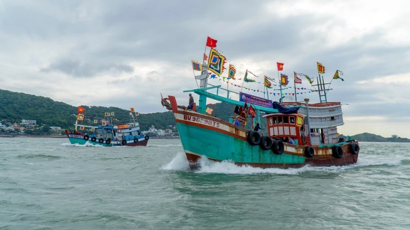 Đoàn ghe tiến ra biển để thực hiện nghi lễ rước Ông về đình thần Thắng Tam. Ảnh: Đoàn Mạnh Dương