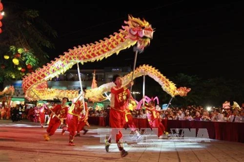 | Các đoàn lân, sư, rồng biểu diễn tại Lễ hội Nguyên tiêu 2017. Ảnh: Phương Vy - TTXVN |