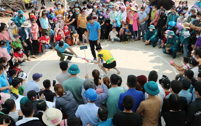 Thi đẩy gậy tại Lễ hội Then Kin Pang. Ảnh: Nguyễn Oanh - TTXVN