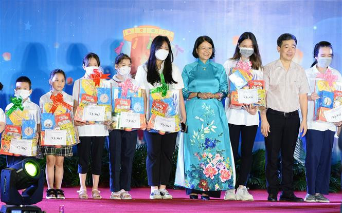 Trao tặng các phần quà cho thiếu nhi có hoàn cảnh khó khăn. Ảnh: Minh Đức - TTXVN