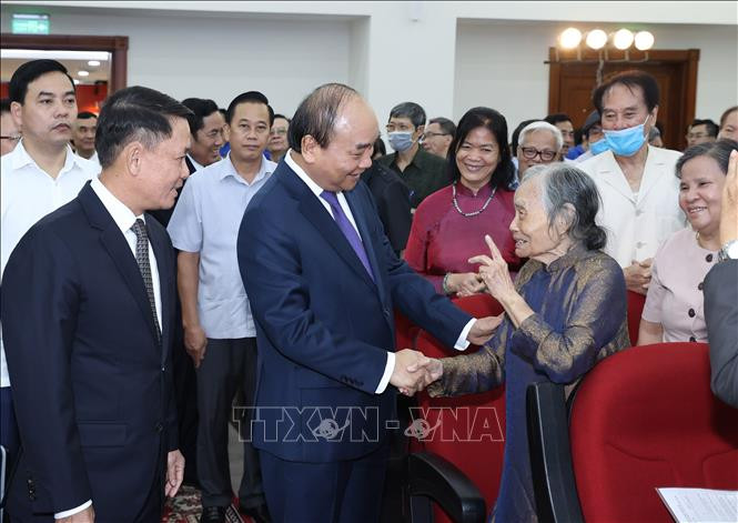 Thủ tướng Nguyễn Xuân Phúc với các cán bộ lão thành Thông tấn xã Việt Nam. Ảnh: Thống Nhất – TTXVN
