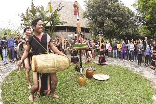 Cuối buổi lễ, dân làng về nhà Rông, tập trung quanh cây nêu để đánh cồng chiêng, múa xoang, uống rượu mừng mùa lúa bội thu.