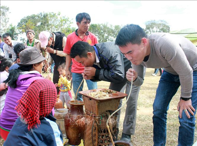 Người dân thưởng thức món rượu ghè tại Lễ hội. Ảnh: Khoa Chương - TTXVN