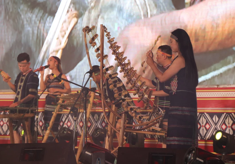 Tiết mục biểu diễn âm nhạc của đoàn nghệ nhân tỉnh Đăk Nông. Ảnh: Dư Toán – TTXVN.