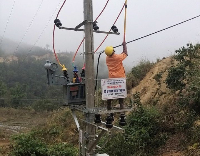 Điện lực Mường Tè, thuộc Công ty Điện lực Lai Châu đóng điện Trạm biến áp 31,5 kVA và cấp điện cho 51/58 hộ dân thuộc bản Nhóm Bố, xã Tá Bạ, huyện Mường Tè. Ảnh: TTXVN phát