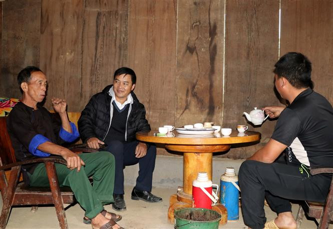 Anh Sùng A Dinh (thứ 2, từ trái sang), Chủ tịch UBND xã Chế Tạo, huyện Mù Cang Chải (Yên Bái) là cán bộ luân chuyển, gần gũi nhân dân để vận động bà con thực hiện đúng chủ trương, chính sách của Đảng, Nhà nước. Ảnh: Việt Dũng - TTXVN