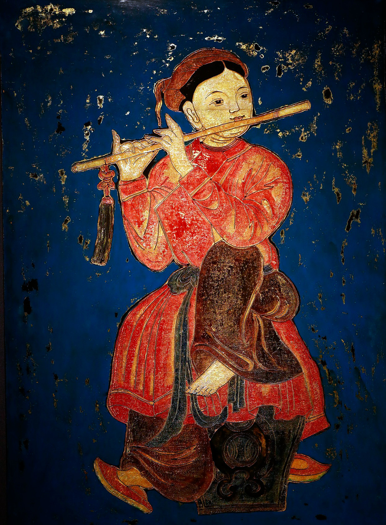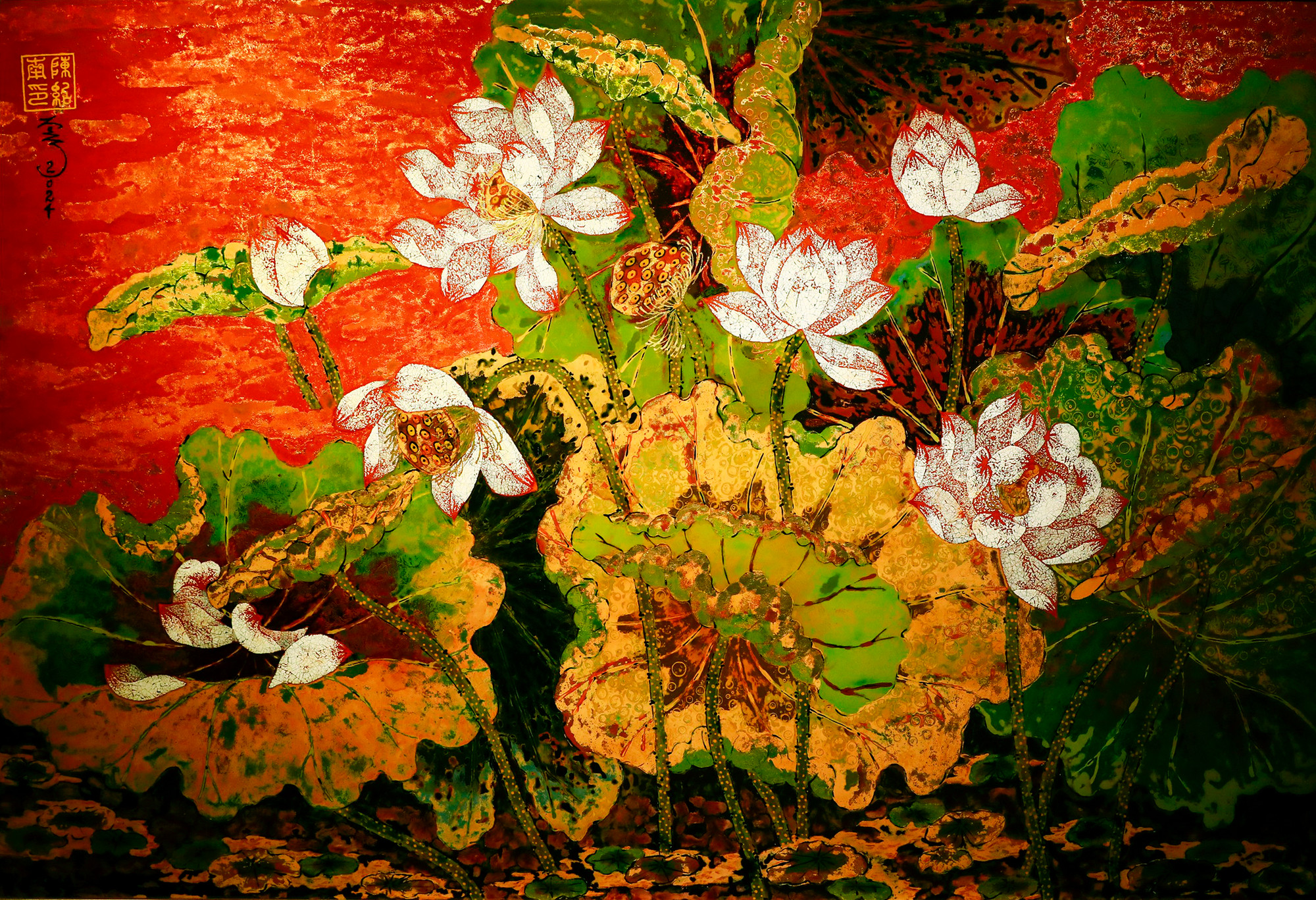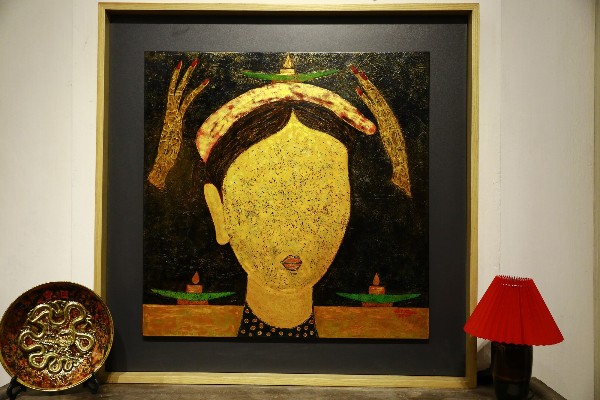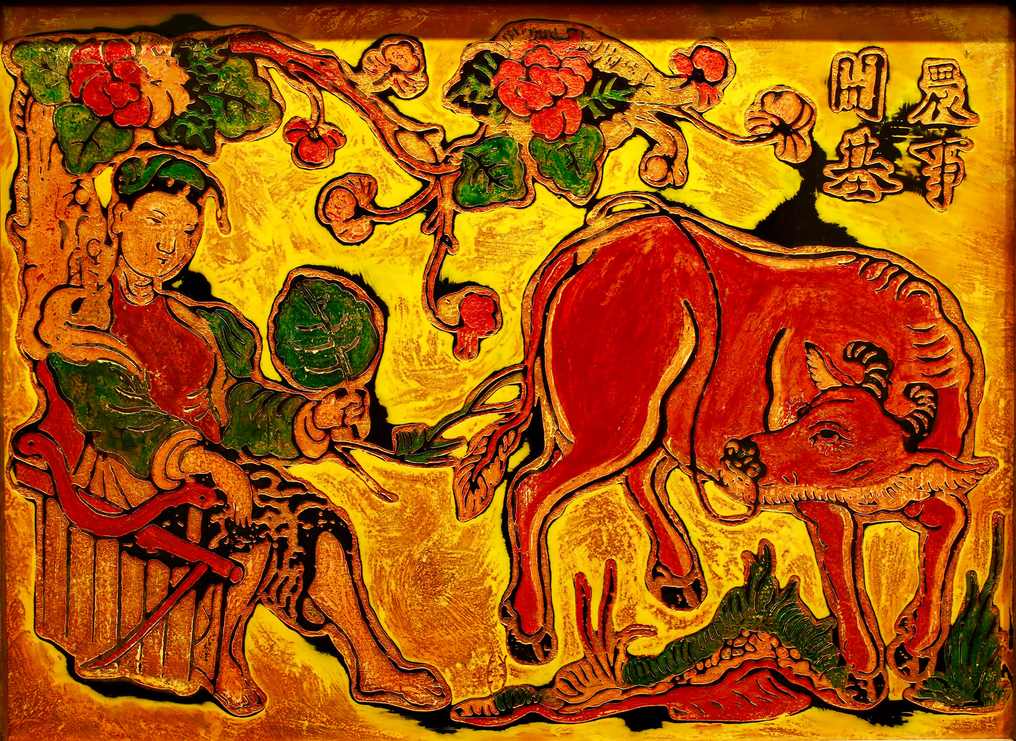 Triển lãm trưng bày trên 60 bức tranh với những đề tài quen thuộc trong tranh dân gian Hàng Trống, Đông Hồ, Kim Hoàng như “Lợn đàn,” “Thần Kê,” “Đánh ghen,” “Ngũ Hổ,” “Đám cưới chuột”… nhưng lại được “tái tạo” trên cơ sở kết hợp kỹ thuật tranh sơn mài với tranh sơn khắc.
