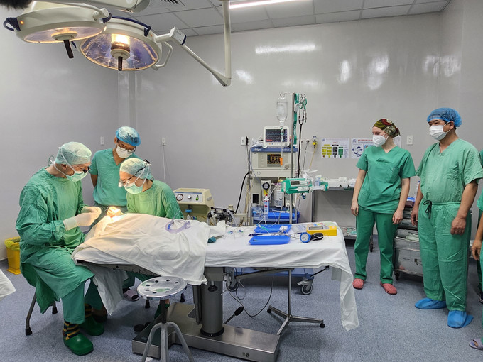 Đoàn phẫu thuật thiện nguyện Interplast (Cộng hòa Liên bang Đức) trực tiếp tham gia phẫu thuật cho các bệnh nhi dị tật khe hở môi vòm miệng tại Bệnh viện Trung ương Huế. Ảnh: Mai Trang – TTXVN