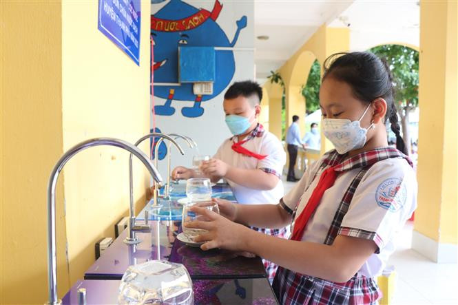 Đưa vào sử dụng hệ thống máy lọc và bồn chứa nước sạch tại 4 trường Tiểu học, mầm non của huyện ven biển Thạnh Phú, tỉnh Bến Tre. Ảnh: Công Trí - TTXVN
