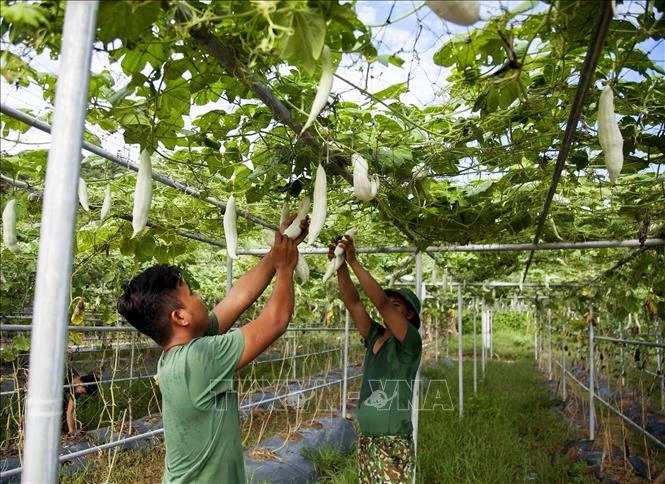 Chiến sỹ Trung đoàn 152 thu hoạch mướp tại Khu tăng gia tập trung. Ảnh: Hồng Đạt - TTXVN