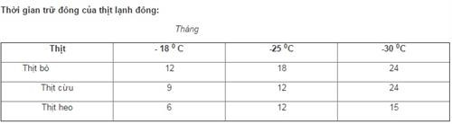 | Thời gian bảo quản thịt ở nhiệt độ từ 0- 2 độ C trong thời gian tối đa là 30 ngày đối với thịt bò tuỳ thuộc vào số lượng vi sinh vật có mặt trong thịt, nhiệt độ, độ ẩm tương đối |