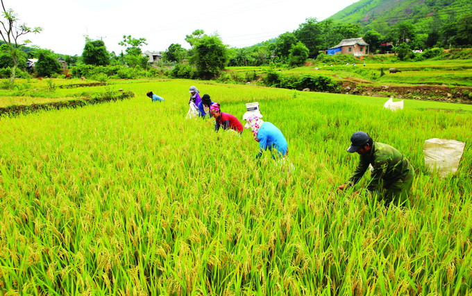 Nông dân ở huyện miền núi Đakrông (Quảng Trị) thu hoạch lúa. Ảnh: Hồ Cầu